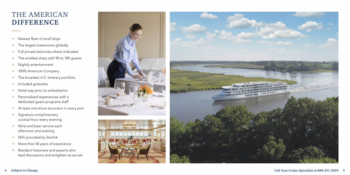 « Newest fleet of small ships « The largest staterooms globally « Full private balconies where indicated « The smallest ships with 90 to 180 guests « Nightly entertainment « 100 % American Company « The broadest U. S. itinerary portfolio « Included gratuities « Hotel stay prior to embarkation
