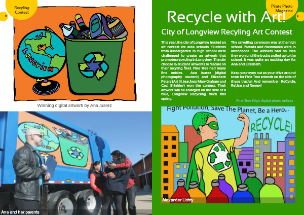 This year, the city of Longview hosted an art contest for area schools. Students from kindergarten to high school were challenged to create an artwork that promotes recycling in Longview. The city choose 16 student artworks to feature on their recyling fleet. Pine Tree had many fine entries. Ana Juarez (digital photography student) and Elizabeth Peters (Art III, teachers Mary Graham and Caci Brinkley) won the contest. Their artwork will be enlarged on the side of a blue, Longview Recycling truck this spring.