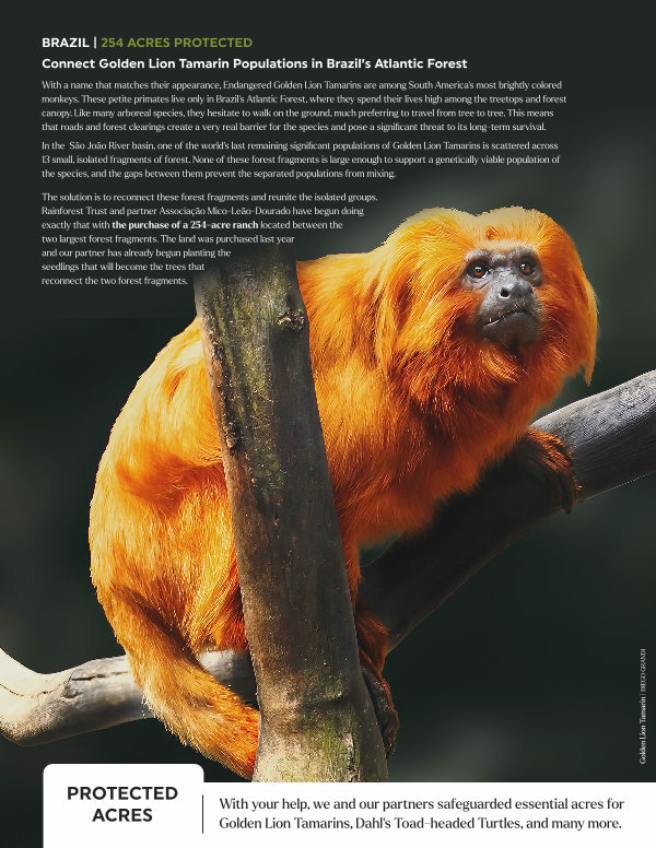 With your help, we and our partners safeguarded essential acres for Golden Lion Tamarins, Dahl’ s Toad-headed Turtles, and many more.