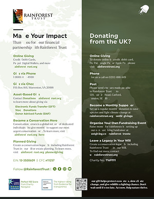 Become a Monthly Supporter Set up a regular monthly donation to save species and fight climate change at: rainforesttrust. org / monthlygivinguk