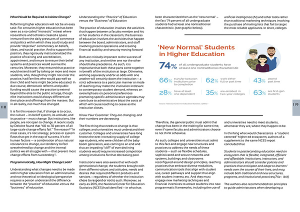 The first thing that needs to change is that colleges and universities must understand their customer. Colleges and universities have long known the ever-increasing supply of college age students, who were children of the baby boom generation, was coming to an end and that an impeding “cliff” of ever declining students would require increased competition among institutions for that decreasing pool.