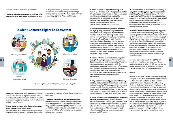 10. Create a network of learning that supports students as creators and entrepreneurs, and agents of their own learning. Empower students to drive their own continuous learning through a digital infrastructure that enables everywhere, all-the-time learning. These will support the variety of learning and credentialing pathways that students pursue throughout the stages of their lives, and need to be flexible to the learner’s needs, interests, and goals, and responsive to constraints around schedule, employment, financial means, and other life circumstances.5