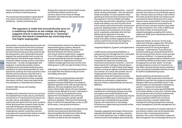 platforms, systems, and applications – some of which are discussed below – that can facilitate health and safety. It is also important when speaking of and prioritizing initiatives to frame the argument in terms of health and safety rather than security alone. Speaking in terms of health and safety is not only inclusive of the entire campus and community but its posture is proactive: speaking solely in terms of security forces a posture of surveillance, of intrusion, which is generally undertaken after the fact. Reframing the argument in this way,