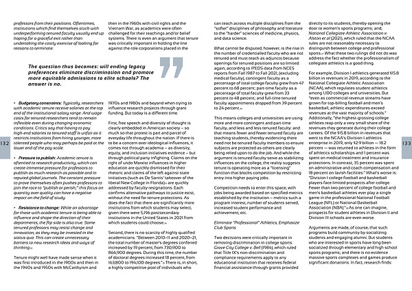 For example, Division I athletics generated $15.8 billion in revenues in 2019, according to the National Collegiate Athletic Association (NCAA), which regulates student athletics among 1,100 colleges and universities. But “even as commercial revenue streams have grown for top-billing football and men’s basketball, athletic expenditures exceed revenues at the vast majority of schools.” Additionally, “the highest-grossing college athletes reap only a very small share of the revenues they generate during their college careers. Of the $15.8 billion in revenues that went to the NCAA’s Division I athletics enterprise in 2019, only $2.9 billion — 18.2 percent — was returned to athletes in the form of athletics scholarships and 1 percent was spent on medical treatment and insurance protections. In contrast, 35 percent was spent on administrative and coach compensation and 18 percent on lavish facilities.” What’s worse is: “Division I college football and basketball players face limited prospects after college. Fewer than two percent of college football and men’s basketball athletes ever play a single game in the professional National Football League (NFL) or National Basketball Association (NBA).”38 As one can imagine, prospects for student athletes in Division II and Division III schools are even worse.