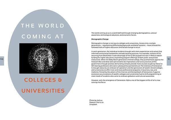 In each generation, the individual students brought with them experiences and values that informed institutional frameworks and educational practices. For example, millions of GIs returning from World War II took advantage of the GI Bill (signed into law in 1944) to obtain funding for higher education, expanding program offerings of both public and private institutions. When the Baby Boom generation entered college, they pushed back against the Vietnam War and what were perceived to be imperialistic and racist practices of the government through protests demanding schools provide more courses taught by liberal or left-leaning professors who were subsequently granted tenure.1 The interests of Generation X, brought about by an embrace of capitalism and the generation of wealth, forced colleges and universities to offer more and more professional programs in business, law, and medicine. Forced by the advent of the Internet and the backlash of Generation Z against excessive accumulations of wealth, colleges and universities had to shift programming to meet needs of students who came to embrace globalism and cultural awareness.