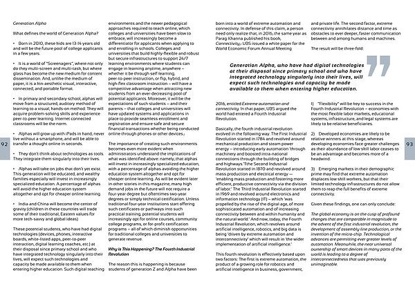 The importance of creating such environments becomes even more evident when administrators understand the implications of what was identified above: namely, that alphas will invest in increasingly specialized education, with a percentage of alphas avoiding the higher education system altogether and opt for cheaper online learning. As will be evident later in other stories in this magazine, many high demand jobs in the future will not require a four-year degree but oftentimes two-year degrees or simply technical certification. Unless traditional four-year institutions start offering such certificates or pathways into such practical training, potential students will increasingly opt for online courses, community college programs, or for-profit certification programs – all of which diminish opportunities for traditional colleges and universities to generate revenue.