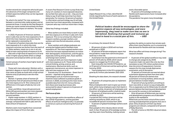 •In 2022, 19 percent of American workers were in jobs that are the most exposed to AI, in which the most important activities may be either replaced or assisted by AI.