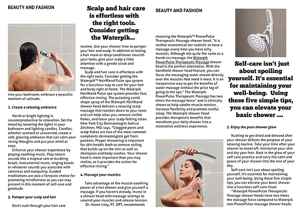 Scalp and hair care is effortless with the right tools. Consider getting the Waterpik⢠HairWand Pulse spa system for a luxurious way to care for your hair and body right at home. The Waterpik HairWand Pulse spa system provides fast, effective rinsing. The pulsating comb shape spray of the Waterpik HairWand shower head delivers a relaxing scalp massage that reaches down to your roots and can help relax you, remove visible flakes, and leave your scalp feeling clean. New York City Dermatologist Joshua Zeichner, MD, says, "Clogged pores and scalp flakes are two of the most common complaints dermatologists get from patients. Proper showering is important for skin health, both to remove soiling that builds up on the skin as well as shampoos and body washes. Your shower head is more important than you may realize, as it provides the action for effective rinsing."