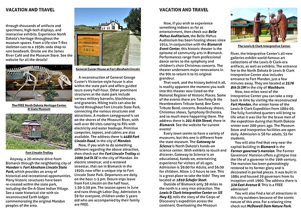River, the Interpretive Center’s all-new galleries exhibit world-famous art collections of the Lewis & Clark-era artifacts, as well as exhibits. The entrance fee to the North Dakota & Lewis & Clark Interpretive Center also includes entrance to Fort Mandan, just a few minutes away. They are located at 2576 8th St SW in the city of Washburn.