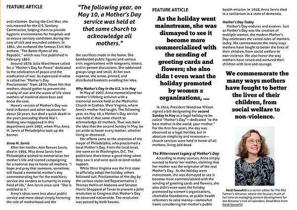 According to many sources, Anna simply wanted to honor her mother, claiming that her mother was the originator of the real Mother’s Day. As the holiday went mainstream, she was dismayed to see it become more commercialized with the sending of greeting cards and flowers; she also didn’t even want the holiday promoted by women’s organizations, charitable foundations, or public health reformers to raise money—somewhat ironic considering her mother’s public