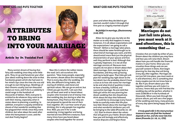 I would like to encourage every future bride to carefully make that life plan two-fold. Dream about the marriage first and what wonderful attributes you will be bringing to the table (Proverbs 31: 10 - 31). Start to dream about the values that will govern your home. Dream about how you will lovingly and effectively resolve disputes and forgive those