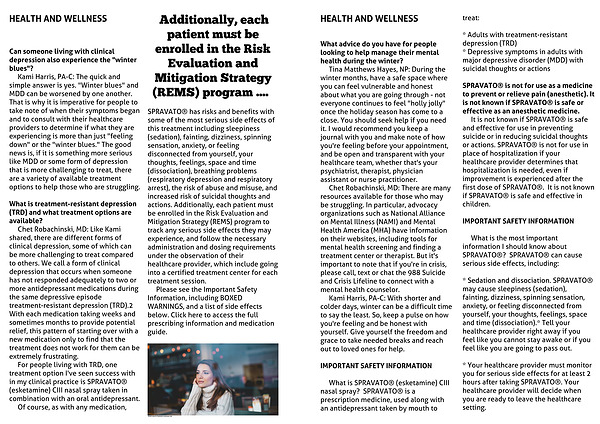 It is not known if SPRAVATO® is safe and effective for use in preventing suicide or in reducing suicidal thoughts or actions. SPRAVATO® is not for use in place of hospitalization if your healthcare provider determines that hospitalization is needed, even if improvement is experienced after the first dose of SPRAVATO®. It is not known if SPRAVATO® is safe and effective in children.