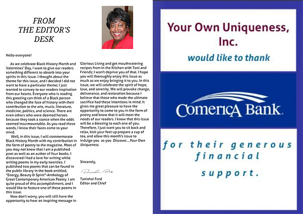 As we celebrate Black History Month and Valentines' Day, I want to give our readers something different to absorb into your spirits in this issue. I thought about the theme for this issue, and I decided I did not want to have a particular theme; I just wanted to convey to our readers inspiration from our hearts. Everyone who is reading this greeting can think of a Black person who changed the face of history with their contribution to the arts, music, literature, medicine, politics, and science. There are even others who were deemed heroes because they took a stance when the odds seemed insurmountable. As you read these words, I know their faces come to your mind.