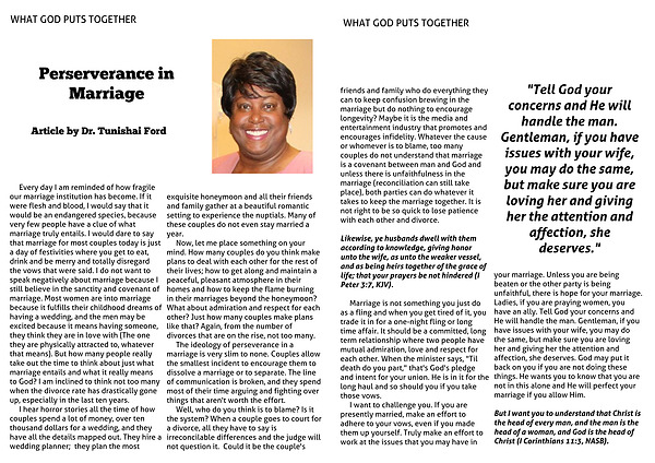 friends and family who do everything they can to keep confusion brewing in the marriage but do nothing to encourage longevity? Maybe it is the media and entertainment industry that promotes and encourages infidelity. Whatever the cause or whomever is to blame, too many couples do not understand that marriage is a covenant between man and God and unless there is unfaithfulness in the marriage (reconciliation can still take place), both parties can do whatever it takes to keep the marriage together. It is not right to be so quick to lose patience with each other and divorce.