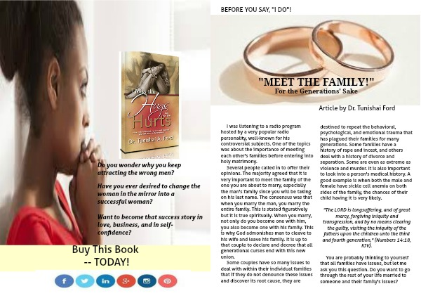 Several people called in to offer their opinions. The majority agreed that it is very important to meet the family of the one you are about to marry, especially the man's family since you will be taking on his last name. The consensus was that when you marry the man, you marry the entire family. This is stated figuratively but it is true spiritually. When you marry, not only do you become one with him, you also become one with his family. This is why God admonishes man to cleave to his wife and leave his family. It is up to that couple to declare and decree that all generational curses end with this new union.