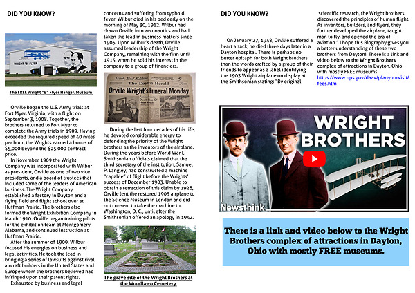 scientific research, the Wright brothers discovered the principles of human flight. As inventors, builders, and flyers, they further developed the airplane, taught man to fly, and opened the era of aviation.” I hope this Biography gives you a better understanding of these two brothers from Dayton! There is a link and video below to the Wright Brothers complex of attractions in Dayton, Ohio with mostly FREE museums. https://www.nps.gov/daav/planyourvisit/fees.htm