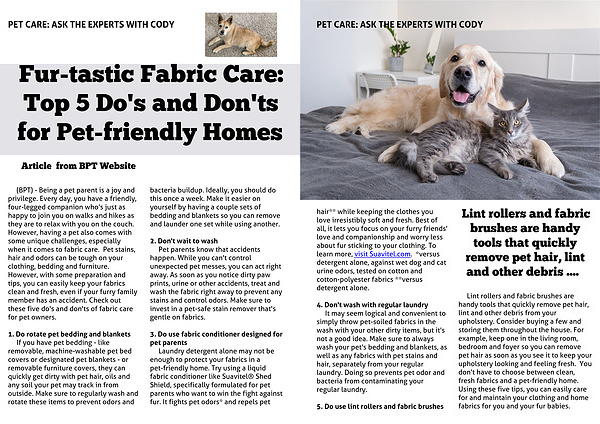 (BPT) - Being a pet parent is a joy and privilege. Every day, you have a friendly, four-legged companion who's just as happy to join you on walks and hikes as they are to relax with you on the couch. However, having a pet also comes with some unique challenges, especially when it comes to fabric care. Pet stains, hair and odors can be tough on your clothing, bedding and furniture. However, with some preparation and tips, you can easily keep your fabrics clean and fresh, even if your furry family member has an accident. Check out these five do's and don'ts of fabric care for pet owners.