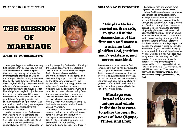 Most people get married because they find someone they believe they can live with and tolerate for some length of time. Yes, they may try to indicate that their intentions are based on love. For the most part, I believe many couples are together because they want to fulfill an objective; be it finding someone who will take care of them, someone who can fulfill their sexual needs, maybe it is for financial gain, or maybe it is just because they do not want to spend the rest of their lives alone. Whatever the reason people have for getting married, we should understand and put into practice the mission that God has given everyone who decides to embark down this threshold of marriage.