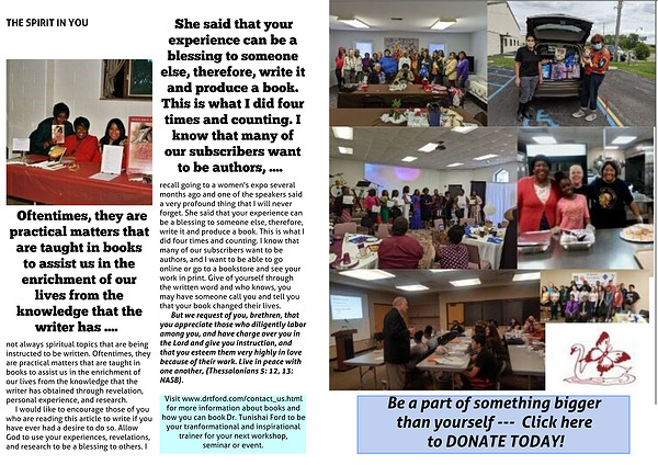 recall going to a women's expo several months ago and one of the speakers said a very profound thing that I will never forget. She said that your experience can be a blessing to someone else, therefore, write it and produce a book. This is what I did four times and counting. I know that many of our subscribers want to be authors, and I want to be able to go online or go to a bookstore and see your work in print. Give of yourself through the written word and who knows, you may have someone call you and tell you that your book changed their lives.