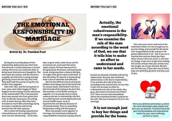 by both to maintain a healthy and loving relationship. Actually, the emotional cohesiveness is the man's responsibility. If we examine the role of the man according to the word of God, we see that it tells him to make an effort to understand and cater to her needs. Hey, guys, that means emotional too (I Peter 3:7). There are too many households where the emotional burden is placed on the wife. She has to keep the fire lit in the marriage.