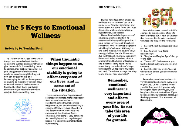 I know firsthand the importance of emotional wellness and how its absence will directly affect your life. I am a cancer survivor, and it has been some years now since I was diagnosed with Hodgkin's disease. Although no one in the medical field told me this, I strongly believe that the illness was due to stress and emotional instability. Because of being in and out of toxic relationships, I harbored unforgiveness and bitterness in my heart. I had a tumor in my chest the size of a large lemon (9cm). God spoke to my heart and said, "Think it not strange that they found a tumor near your heart."