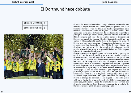 El Borussia Dortmund conquistó la Copa Alemana haciéndole “una manita” al Bayern Múnich. El Borussia gana por primera vez en su historia este trofeo. Tras dos títulos de Bundesligaseguidos y cinco victorias consecutivas sobre el Bayern, el fútbol alemán está cambiando radicalment de “grandes”. En cuarto minuto de partido se produjo el primer gol del Dortmund, tras una pérdida de balón del Múnich cerquita del área. En esa acción marco el japonésShinji Kagawa, que marcó sin ninguna dificultad despuésde recibir un gran centro de Blaszczykowski, con la defensa del Bayern sin orden. El Bayern tuvo muy pocos espacios y frecuentemente tuvo que recurrir a balonazosarriba buscando a SuperMario Gómez. Gómez fue derribado por el meta del Dortmund y el colegiado señaló penalti.ArjenRobbben, tuvo la responsabilidad de no fallar la pena máxima, el holandés al final, anotó.