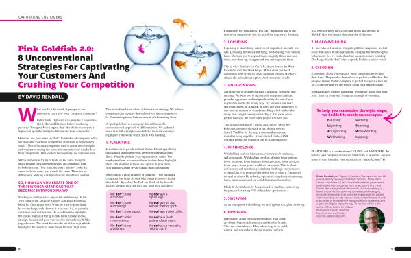 A “ pink goldfish ” is a company that embraces this unconventional approach to differentiation . We gathered more than 300 examples and distilled them into a simple eight-part framework , which starts with flaunting .