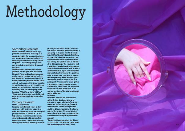 Books-“ We were feminists once” supported this dissertation massively as it gave insight into the history of feminism and marketing and general background knowledge of feminism in today’ s world. Magazines- Pacific Magazine gave expert knowledge into the fourth wave of feminism. Websites- News websites such as the guardian, the independent, Buzz Feed, New York Times and the Telegraph were used to gather detailed evidence of current day issues. Trend reports from LS: N Global provided a professional and future outlook on the subject. Business websites such as business insider and trend hunter were used to develop an argument for marketing from a business perspective. Podcasts-“ What Mom Never Told You”-“ Empowertising podcast provided knowledge of marketing techniques aimed at females.