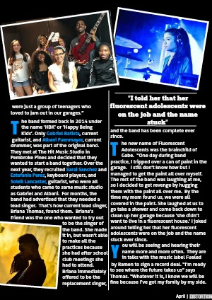 guitarist, and Albani Fuenmayor, current drummer, was part of the original band. They met at The Hit Music Studio in Pembroke Pines and decided that they wanted to start a band together. Over the next year, they recruited Sarai Sanchez and Estefania Perez, keyboard players, and Soleil Lancaster, guitarist, who were all students who came to same music studio as Gabriel and Albani. For months, the band had advertised that they needed a lead singer. That’s how current lead singer, Briana Thomas, found them. Briana’s friend was the one who wanted to try out to be the singer of the band. She made it in, but wasn’t able to make all the practices because she had after school club meetings she had to attend.