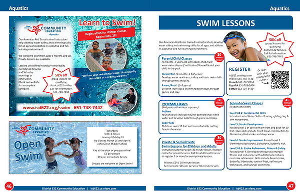 50 % off group lessons for qualifying district 622 families . Call for information .