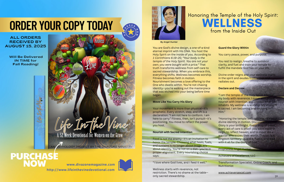 You are God’ s divine design, a one-of-a-kind eternal imprint with His DNA. You host the Holy Spirit on the inside of you. According to 1 Corinthians 6:19 – 20,“ Your body is the temple of the Holy Spirit. You are not your own; you were bought with a price.” That truth transforms wellness from self-care to sacred stewardship. When you embrace this, everything shifts. Wellness becomes worship. Fitness becomes faith in motion. Nourishment becomes a love offering to the One who dwells within. You’ re not chasing identity— you’ re walking out the masterpiece that was etched into your being before time began.