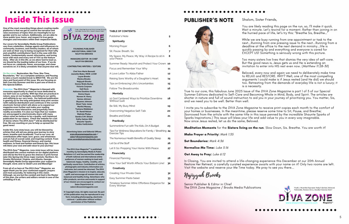 True to our core, this fabulous June 2025 Issue of the DIVA Zone Magazine is part 1 of 3 of our Special Summer Editions dedicated to Self-Care and Becoming Whole in Mind, Body, and Spirit. The articles are shorter in nature and full of sound instruction to aid you in your journey of prioritizing you. You matter, Sis, and we need you to be well. Better than well.