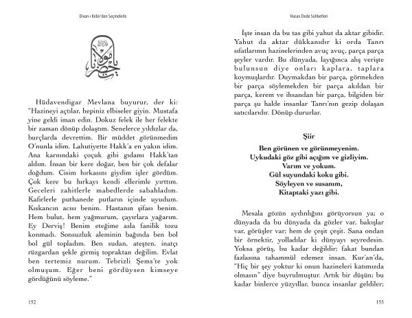 Hüdavendigar Mevlana buyurur , der ki : “ Hazineyi açtılar , hepiniz elbiseler giyin . Mustafa yine geldi iman edin . Dokuz felek ile her felekte bir zaman dönüp dolaştım . Senelerce yıldızlar da , burçlarda devrettim . Bir müddet görünmedim O ’ nunla idim . Lahutiyette Hakk ’ a en yakın idim . Ana karnındaki çoçuk gibi gıdamı Hakk ’ tan aldım . İnsan bir kere doğar , ben bir çok defalar doğdum . Cisim hırkasını giydim işler gördüm . Çok kere bu hırkayı kendi ellerimle yırttım . Geceleri zahitlerle mabedlerde sabahladım . Kafirlerle puthanede putların içinde uyudum . Kıskancın acısı benim . Hastanın şifası benim . Hem bulut , hem yağmurum , çayırlara yağarım . Ey Derviş ! Benim eteğime asla fanilik tozu konmadı . Sonsuzluk aleminin bağında ben bol bol gül topladım . Ben sudan , ateşten , inatçı rüzgardan şekle girmiş topraktan değilim . Evlat ben tertemiz nurum . Tebrizli Şems ’ te yok olmuşum . Eğer beni gördüysen kimseye gördüğünü söyleme .”