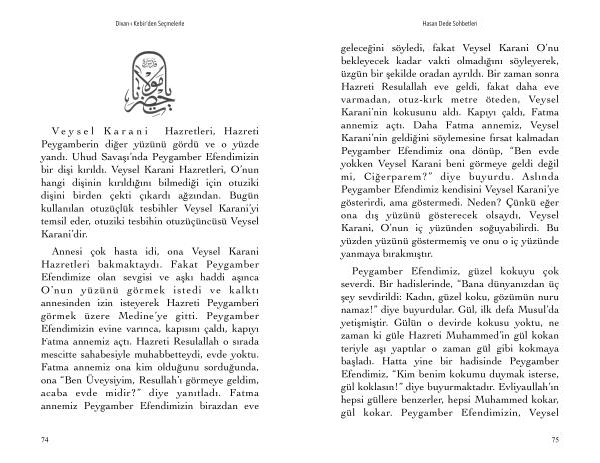 geleceğini söyledi , fakat Veysel Karani O ’ nu bekleyecek kadar vakti olmadığını söyleyerek , üzgün bir şekilde oradan ayrıldı . Bir zaman sonra Hazreti Resulallah eve geldi , fakat daha eve varmadan , otuz-kırk metre öteden , Veysel Karani ’ nin kokusunu aldı . Kapıyı çaldı , Fatma annemiz açtı . Daha Fatma annemiz , Veysel Karani ’ nin geldiğini söylemesine fırsat kalmadan Peygamber Efendimiz ona dönüp , “ Ben evde yokken Veysel Karani beni görmeye geldi değil mi , Ciğerparem ?” diye buyurdu . Aslında Peygamber Efendimiz kendisini Veysel Karani ’ ye gösterirdi , ama göstermedi . Neden ? Çünkü eğer ona dış yüzünü gösterecek olsaydı , Veysel Karani , O ’ nun iç yüzünden soğuyabilirdi . Bu yüzden yüzünü göstermemiş ve onu o iç yüzünde yanmaya bırakmıştır .
