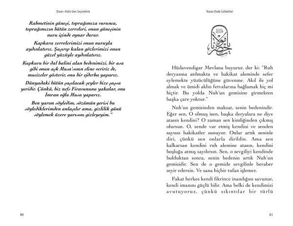 Nuh ’ un gemisinden maksat , senin bedenindir . Eğer sen , O olmuş isen , başka deryalara ne diye atasın kendini ? O zaman sen kimliğinden çıkmış olursun . O , sende var etmiş kendini ve senden sayısız hakikatler sunuyor . Onlar artık seninle diri , çünkü sen onlarla dirildin . Ama sen kalkarsan kendini ruh alemine atasın , kendini boşluğa atmış sayılırsın . Sen , o sevgiliyi kendinde bulduktan sonra , senin bedenin artık Nuh ’ un gemisidir . Sen de o gemide sevgilinle beraber seyir edersin . Ve sana hiçbir tufan işlemez .