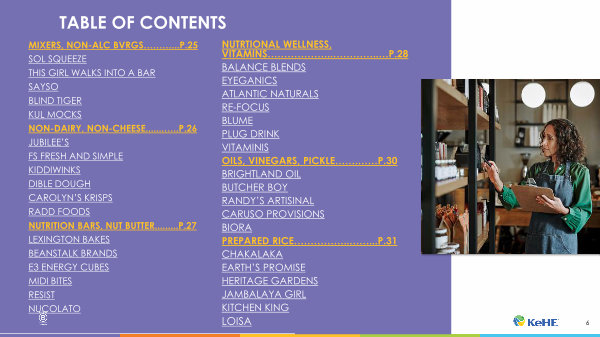 MIXERS, NON-ALC BVRGS ………... P. 25 SOL SQUEEZE THIS GIRL WALKS INTO A BAR SAYSO BLIND TIGER KUL MOCKS NON-DAIRY, NON-CHEESE.......….. P. 26 JUBILEE’ S FS FRESH AND SIMPLE KIDDIWINKS DIBLE DOUGH CAROLYN’ S KRISPS RADD FOODS NUTRITION BARS, NUT BUTTER......... P. 27 LEXINGTON BAKES BEANSTALK BRANDS E3 ENERGY CUBES MIDI BITES RESIST NUCOLATO