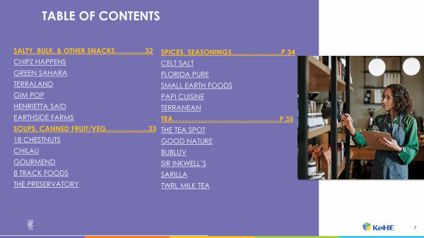 SALTY, BULK, & OTHER SNACKS …………. 32 CHIPZ HAPPENS GREEN SAHARA TERRALAND GIM POP HENRIETTA SAID EARTHSIDE FARMS SOUPS, CANNED FRUIT / VEG ……………… 33 18 CHESTNUTS CHILAU GOURMEND 8 TRACK FOODS THE PRESERVATORY
