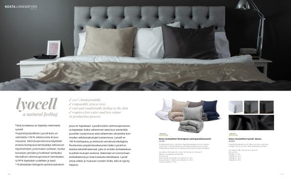 Tässä tuotteessa on käytetty materiaalia Lyocell . Ympäristöystävällinen Lyocell-kuitu on valmistettu 100 % selluloosasta eli puumassasta . Valmistusprosessissa käytetään erilaisia biohajoavia kemikaaleja selluloosan hajottamiseen , josta kuidut uutetaan . Kuidut kuivataan , pestään ja kudotaan kankaaksi . Kemiallisen valmistusprosessin kemikaaleista 99 % käytetään uudelleen ja loput 1 % lähetetään biologisiin puhdistulaitoksiin jossa ne hajotetaan . Lyocell-kuidun valmistusprosessissa käytetään lisäksi vähemmän vettä kuin esimerkiksi puuvillan tuotannossa sekä vähemmän väriainetta kuin muiden selluloosakuitujen tuotannossa . Lyocell on 100 % biohajoava , ja viskoosiin verrattuna ekologista . Positiivisten ympäristövaikutusten lisäksi Lyocell on kestävä tekstiilimateriaali , joka on erittäin korkealaatuista pitkien kuitujen ansiosta . Materiaali on luonnostaan antibakteerista ja imee kosteutta tehokkaasti . Lyocell antaa viileän ja mukavan tunteen iholle , eikä se rypisty helposti .