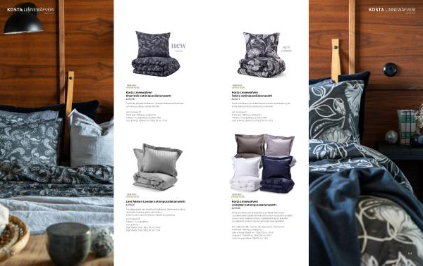 Väri : valkoinen 00 , t . sininen 58 , harmaa 95 , t . harmaa 97 Materiaali : 100 % puuvillasatiini Koko ja hinta : 50x60 cm , 150x210 cm / 59 € Kingsize 2 x 50x60 cm , 230x220 cm / 89 € Extra tyynynpäällinen 50x60 cm / 10 €