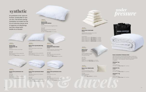 Ett syntettäcke är lätt , mjukt och formbart . Syntetkudden är mjuk och skön , med slitstarkt yttertyg . Syntettäcken och kuddar kan tvättas och torktumlas , det gör att de är hygieniska och allergi vänliga , även efter många tvättar behåller de sin karaktär .