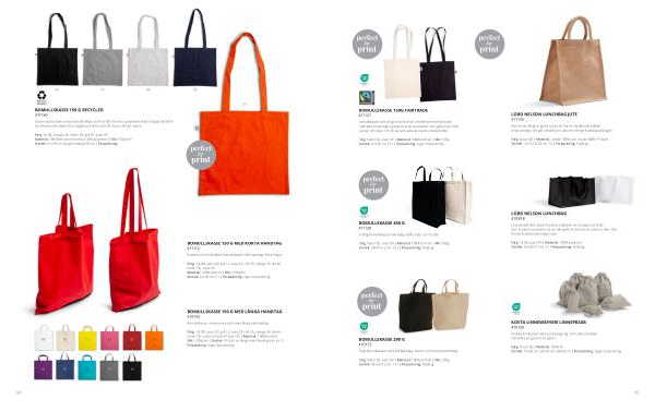 Färg : Vit 00 , orange 36 , marin 58 , grå 95 , svart 99 Material : 70 % återvunnen bomull , 30 % polyester | Vikt : 150 g / m ² Storlek : 41x38 cm , längd handtag 68 cm | Förpackning :