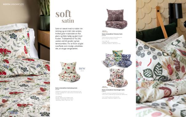 Satin er vævet med to tråde i én retning og en tråd i den anden , hvilket giver materialet en flot glans og føles kølig og glat mod huden . Trådtæthed er fra 200 , vaskes ved 60 grader og kan tørretumbles . For at få en så glat overflade som muligt , anbefales det , at stryge sengesættet . new 2023