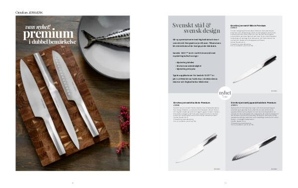 Svenskt stål & svensk design Orrefors Jernverk Filékniv Premium 410940 För den matlagningsintresserade är filékniven ett kuttersmycke i köket. Här är knivbladet långt, smalt och lätt böjligt för att man ska kunna följa skinnet på tex fisken när man ska filéa. Den fungerar också utmärkt att putsa fågel och kött med. En kniv med bra balans mellan blad och handtag. Även denna kniv i vår Premiumserie har svenskt stål i bladet och är designad av Jon Eliason. Storlek: Bladet 20 cm Förpackning: presentkartong Pris: (1-24 st) 849:- (vid 25 st) 799:- Vår nya premiumserie med högkvalitativa knivar i svenskt stål. Designade av Jon Eliason. Tillsammans blir det det bästa från Sverige på din köksbänk. Sandvik 12C27 ™ är ett rostfritt kromstål med mycket hög kolhalt som ger – Mycket hög hårdhet – Bra korrosionsbeständighet – Mycket hög slitstyrka Typiska applikationer för Sandvik 12C27 ™ är jakt- och fiskeknivar, fackknivar, skridskoskenor, isborrar och högkvalitativa köksknivar. nyhet 9930099 2019 Orrefors Jernverk Kockkniv Premium Orrefors Jernverk Japansk Kockkniv Premium Redo för storverk i köket? I denna kockkniv har vi blandat det bästa från Sverige. Bladet är av svenskt stål och designen står Jon Eliason för. Tyngden i bladet gör att kniven ligger tryggt och säkert i handen. En kockkniv är något av det första man köper till sitt hem. Den här kniven är en perfekt gåva, även till den mycket medvetne kocken. Storlek: Bladet 20 cm Förpackning: presentkartong Pris: (1-24 st) 849:- (vid 25 st) 799:- Både proffs och hemmakockar väljer i allt större utsträckning att använda sig av japanska knivar vilket inte är svårt att förstå. De japanska köksknivarna erbjuder en över tusen år lång tradition av kvalitet och det är fantastiskt att vi idag kan ta del av den kunskap och det hantverk som har förfinats under så lång tid. I denna kniv möter japanska tusenåriga traditioner ett förstaklassigt svenskt stål i svensk design - en oslagbar kombination! Storlek: Bladet 18 cm Förpackning: presentkartong Pris: (1-24 st) 849:- (vid 25 st) 799:- 410938 410939 9930099 9930099 73