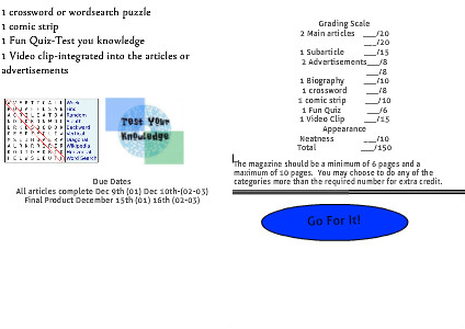 The magazine should be a minimum of 6 pages and a maximum of 10 pages. You may choose to do any of the categories more than the required number for extra credit.