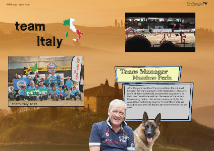 After the good results of the 2012 edition. Massimo will be again the team manager of the Italian team. Massimo is one of the most famous and powerful dog trainers in Italy. He’ s from Rome and he’ s the owner of the Indiana Kayowa dog centre. He’ s active in every sport, but his main activity is training dogs for TV and Movie sets. We must be aware that the italians can win more than the last year!