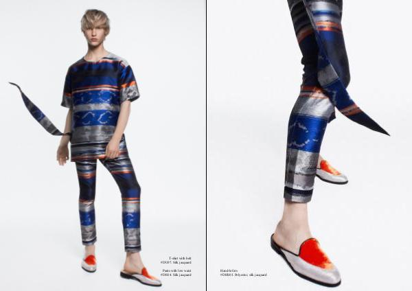 T-shirt with belt #DU07. Silk jacquard Pants with low waist #DH14. Silk jacquard Hand-lofers #DHS03. Polyester, silk jacquard