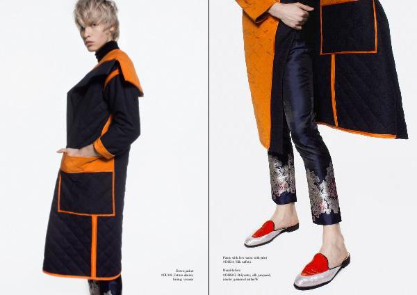 Pants with low waist with print #DH24. Silk taffeta Down jacket #DU08. Cotton denim; lining: viscose Hand-lofers #DHS03. Polyester, silk jacquard, insole: genuine leatherW