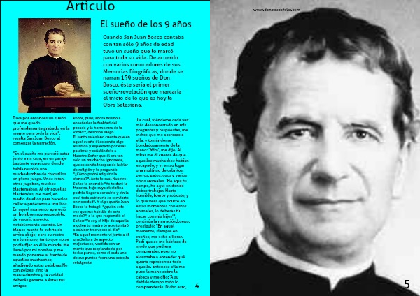 Cuando San Juan Bosco contaba con tan sólo 9 años de edad tuvo un sueño que lo marcó para toda su vida. De acuerdo con varios conocedores de sus Memorias Biográficas, donde se narran 159 sueños de Don Bosco, éste sería el primer sueño-revelación que marcaría el inicio de lo que es hoy la Obra Salesiana.