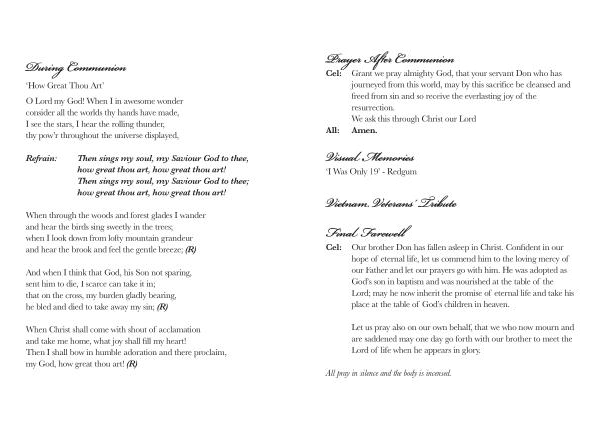 Our brother Don has fallen asleep in Christ . Confident in our hope of eternal life , let us commend him to the loving mercy of our Father and let our prayers go with him . He was adopted as God ’ s son in baptism and was nourished at the table of the Lord ; may he now inherit the promise of eternal life and take his place at the table of God ’ s children in heaven .