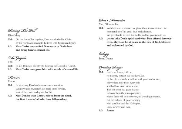 With love and reverence we place these mementos of Don to remind us of his great love and affection . We give thanks to God for his life and his goodness to us . Let us take Don ’ s spirit and what Don offered into our lives . May Don be at peace in the city of God , blessed and welcomed by God .